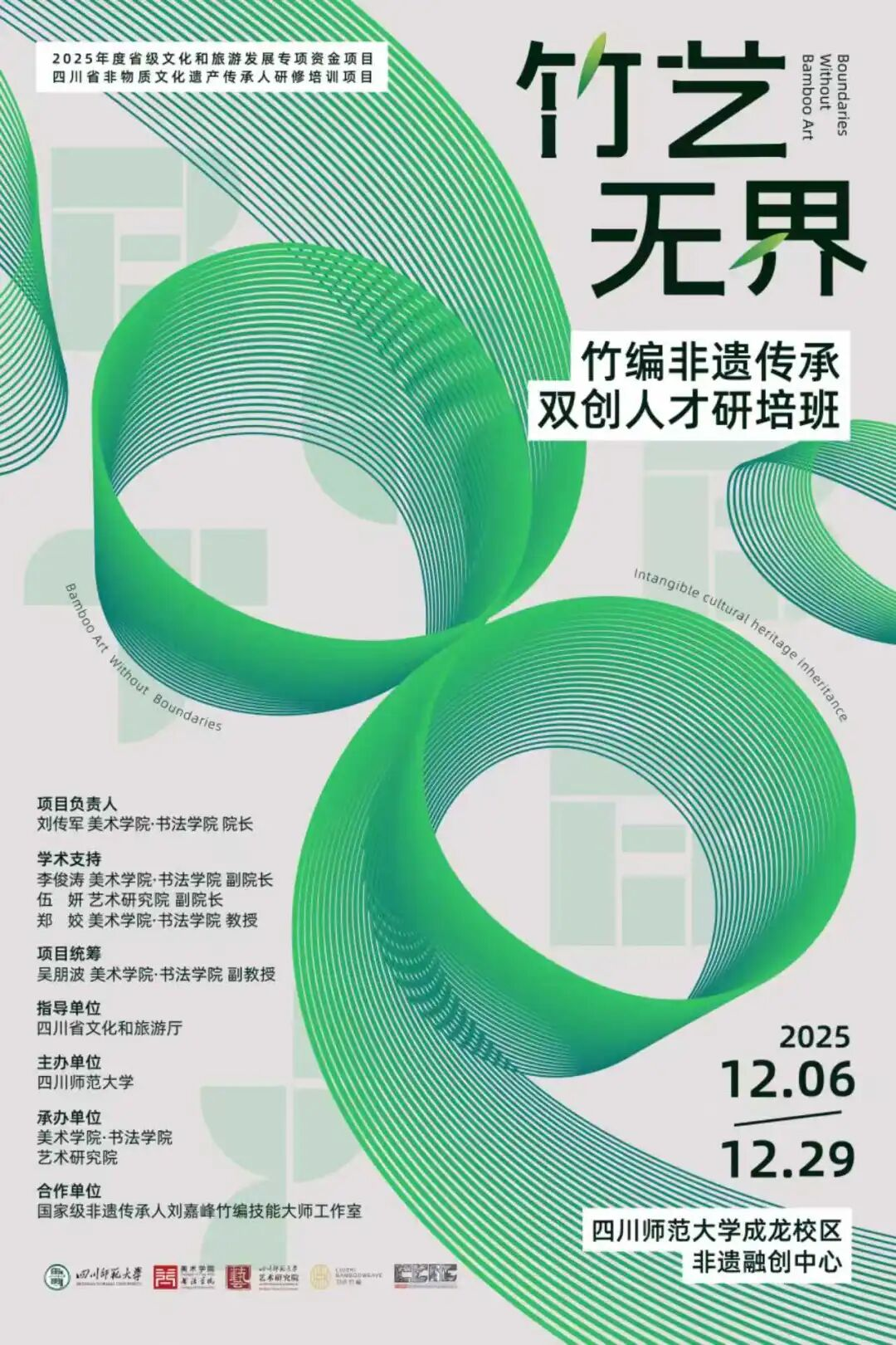 2025年12月6日,由四川省文化和旅游厅、教育厅、人力资源社会保障厅联合指导,四川师范大学主办,四川师范大学美术学院·书法学院与艺术研究院共同承办的“竹艺无界”竹编非遗传承双创人才研培班正式开启。本次研培班旨在依托四川竹资源禀赋和文化底蕴,聚焦竹编与公共艺术、现代装置等的跨界融合,提升传承人在公共艺术、空间设计与现代科技融合等方面的综合能力,拓展竹编在当代艺术语境中的表现力与应用空间。