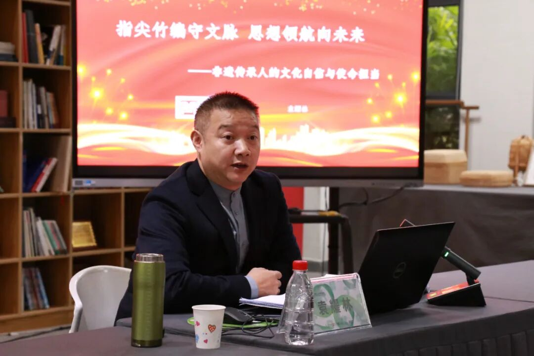 最后,四川师范大学美术学院·书法学院党委书记袁耀林围绕学习贯彻习近平文化思想,进行了《指尖竹编守文脉 思想领航向未来——非遗传承人的文化自信与使命担当》专题讲座。袁书记指出,习近平文化思想是新时代文艺工作者在履行推动文化繁荣、建设文化强国历史使命时的强大思想武器与科学行动指南。他强调省委十二届七次全会提出“锦绣天府·安逸四川”品牌战略对于竹编非遗传承是一次难得的机遇,值此机会,非遗传承人应坚定文化自信,实现精神上的独立自主,坚定文化自信与使命担当。