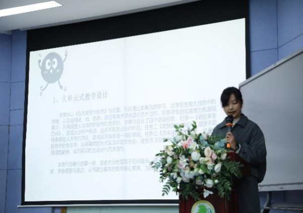 在教学经验分享环节,孙晓娇老师以《调皮多动的点》为主题,结合获奖课例视频分享了针对一年级学生的美术教学设计思路。她从课前学情精准研判入手,详细介绍了为调皮多动学生设置“小组创意组长”“工具管理员”等专属角色,配备趣味异形模板和彩色荧光笔等定制化工具的具体策略,还通过视频片段展示了如何将学生的过剩精力转化为创作动力,这都为即将要走向教育实习岗位的师范生提供了教学和管理的参考。