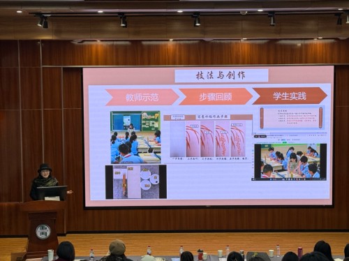 成都市武侯区代小娅名师工作室领衔人、中学高级教师代小娅,以“执美之手 与教同行”为主题,分享30余年美术教育经验。她提出美术师范生需练就“四大核心能力”:一是“慧眼”,善于发现学生作品中的闪光点;二是“双语言体系”,将专业术语转化为儿童易懂的比喻与故事;三是“综合教学工具箱”,开发纸艺、刺绣、扎染等多元课程;四是“匠心”,坚持课后反思与专业创作。代老师还通过挖掘“磨子桥文化”,用超轻粘土创作“磨子人家做豆腐”系列的创新实践,丰富美术课堂,也成为省内粘土教学推广的先行者。
