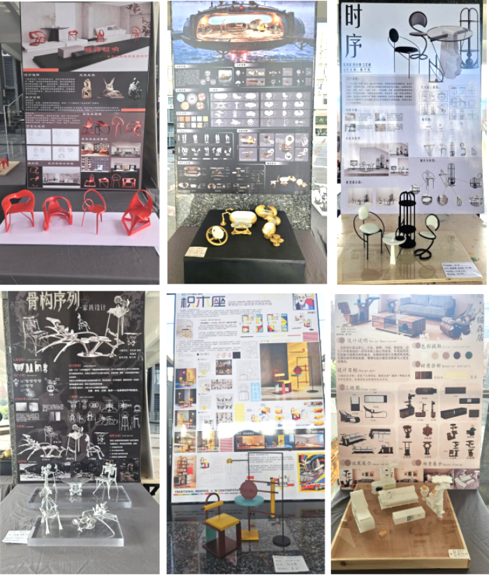 美术学院·书法学院基于其艺术专业前沿性、创新性特性,致力于推动AIGC在设计、艺术、教育和文化应用方面的创新和拓展,并将其与相关艺术领域进行连接,将打造成相对前沿和完整的AIGC技术运用体系。《家具与陈设设计》课程是环境设计专业核心课程之一,是环境设计专业2023级引入AI生成式技术,助力家具设计创意的教学总结和成果展示。课程展由袁园、陈宁萍、鲁引、袁元4位老师共同组织,环境设计2023级14、15、16、18班同学全体参与,邀请了四川大学锦江学院环境设计系主任龙国跃教授、四川大学艺术学院鲁苗副教授、西华大学环境设计系主任舒悦教授观展指导。