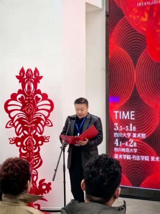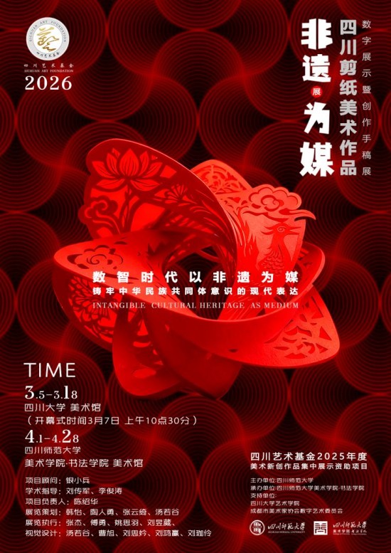 2026年3月7日上午10点30分,四川艺术基金2025年度美术新创作品集中展示资助项目:数智时代以非遗“为媒”铸牢中华民族共同体意识的现代表达——四川剪纸美术作品数字展示暨创作手稿展开幕式在四川大学美术馆隆重举行。