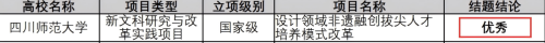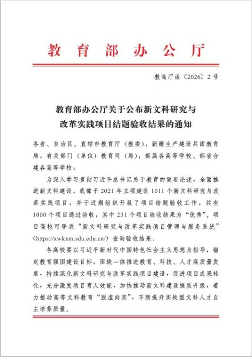 近日,教育部办公厅印发《教育部办公厅关于公布新文科研究与改革实践项目结题验收结果的通知》(教高厅函〔2026〕2号),正式公布项目结题验收结果。我院承担的教育部首批新文科研究项目“设计领域非遗融创拔尖人才培养模式改革”荣获“优秀”等级,成为四川省仅有的两个以“优秀”等级结题的项目之一。这一佳绩是学院深入贯彻落实新时代人才强国战略、系统推进非遗美育改革与创新人才培养的重要成果,充分彰显了学院在理论研究、实践探索与高水平人才培养方面的综合实力。