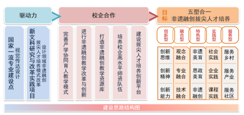 通过系统改革,项目团队摸索出一套可借鉴、可复制、可推广的“非遗融创拔尖设计类人才培养模式”,形成了“五型合一·非遗融创·服务区域”的核心理念。该模式以市场需求为导向,以弘扬区域优秀传统文化为使命,以创新和实践能力培养为目标,以特色非遗美育改革项目为引领,全面提升设计人才培养质量。