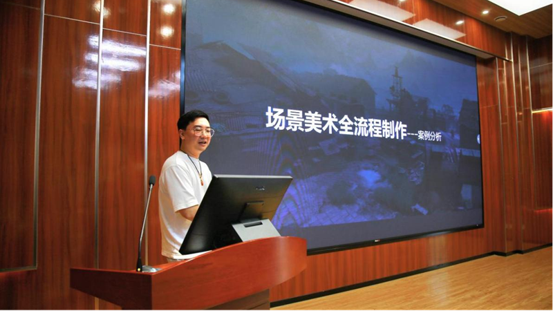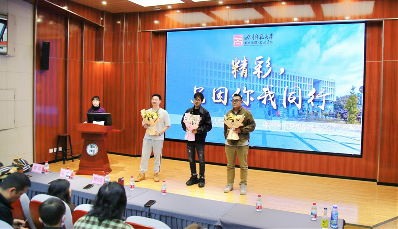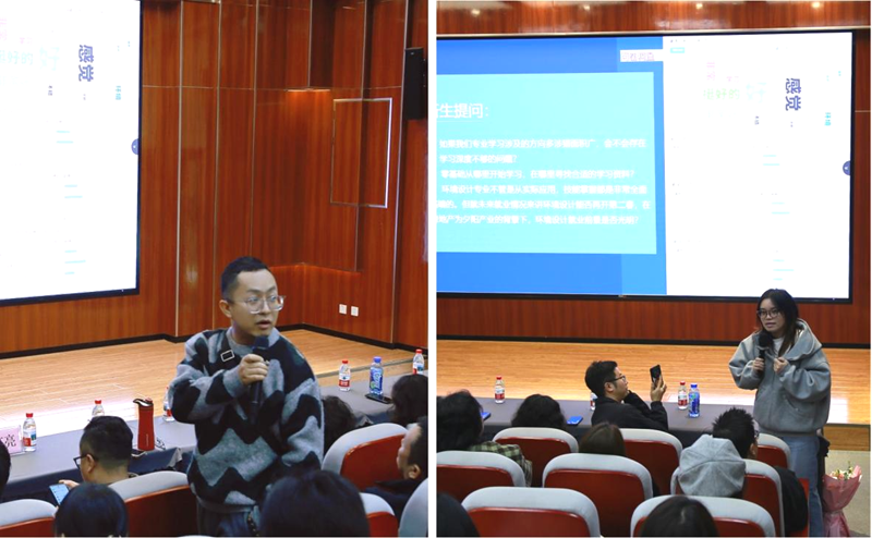 下半场的校友设计行业分享环节精彩纷呈。已跨界游戏建模领域的成都夏尔游戏地编主管兼模块项目总监郑伟校友,结合自身从环艺设计到数字建模的职业跨界经历,通过具体项目案例拆解了游戏场景设计的创作逻辑与技术要点。自主创业成立成都筑象空间设计创始人、桃李青年设计师学院学生会会长周红亮校友,以别墅室内设计项目为样本,从空间布局、材料选型到落地执行的全流程进行复盘,展现了设计实践的完整链条。拥有海外工作经历的石室设计工作室创始人、四川睿旭置业有限公司设计总监石鹏校友则分享了国内外建筑与景观设计的差异,通过自身参与的地标项目案例,解读了设计中的人文考量与创新思维,最后他回顾大学时光时寄语新生:“扎实的专业基础是设计之路的基石”。