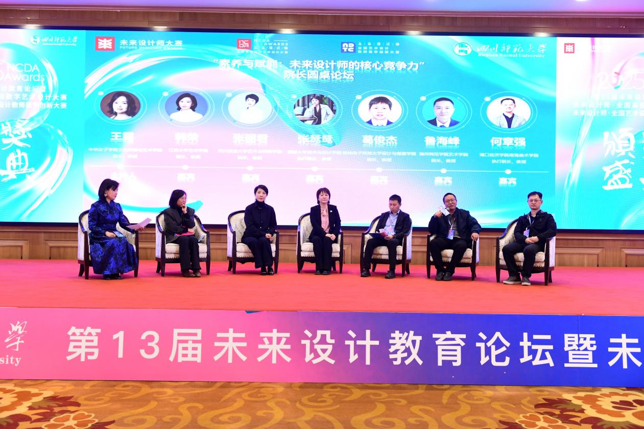 在中华女子学院文化传播与艺术学院院长王露教授的主持下,江苏大学艺术学院院长韩荣教授,四川农业大学艺术与传媒学院院长张丽君教授,成都大学美术与设计学院执行院长张鸶鸶教授,桂林电子科技大学设计与创意学院院长葛俊杰教授,湖州师范学院艺术学院院长鲁海峰教授:海口经济学院南海美术学院执行院长何章强教授围绕“素养与赋能:未来设计师的核心竞争力”进行了第二场圆桌论坛。