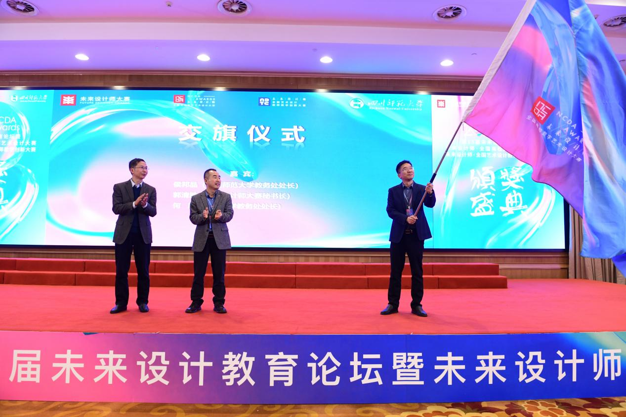 在全体与会者的见证下,郭胜清先生从四川师范大学教务处处长侯邦品教授手中接旗,并将象征着大赛精神与使命的会旗,郑重交予下届承办单位代表——河南大学教务处处长何欣教授手中。何欣教授表示将全力筹备好2026年的活动,延续盛会辉煌。旗帜的传递,不仅意味着大赛薪火相传、接力前行,更预示着设计创新事业永不停歇、未来可期,将现场气氛推向又一个高潮。
