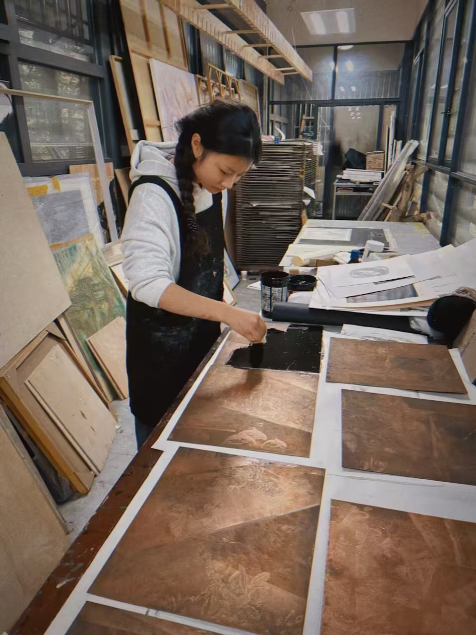 彭茂莉的入选作品《光年絮语·遥观共生》以铜版画这一兼具传统质感与当代表现力的艺术形式为载体,巧妙呼应展览“共生”主题。作品通过精细的刻制与晕染技法,将时间维度的“光年”与情感维度的“絮语”相融合,以虚实相生的视觉语言,探讨人与自然、传统与现代、个体与世界的依存关系。画面中,细腻的线条与层次丰富的色调交织,既展现了铜版画独有的肌理美感,又传递出对人类命运共同体的深刻思考,彰显了青年艺术家对时代议题的敏锐感知与艺术表达力。